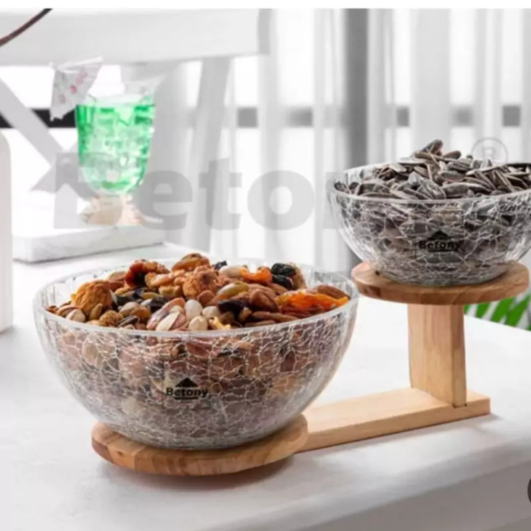 ظرف ۲ طبقه ، جنس شیشه ترک ، پایه چوب راش ، ظرف بالایی کمی بزرگتر از پایینی هست .