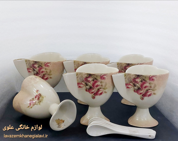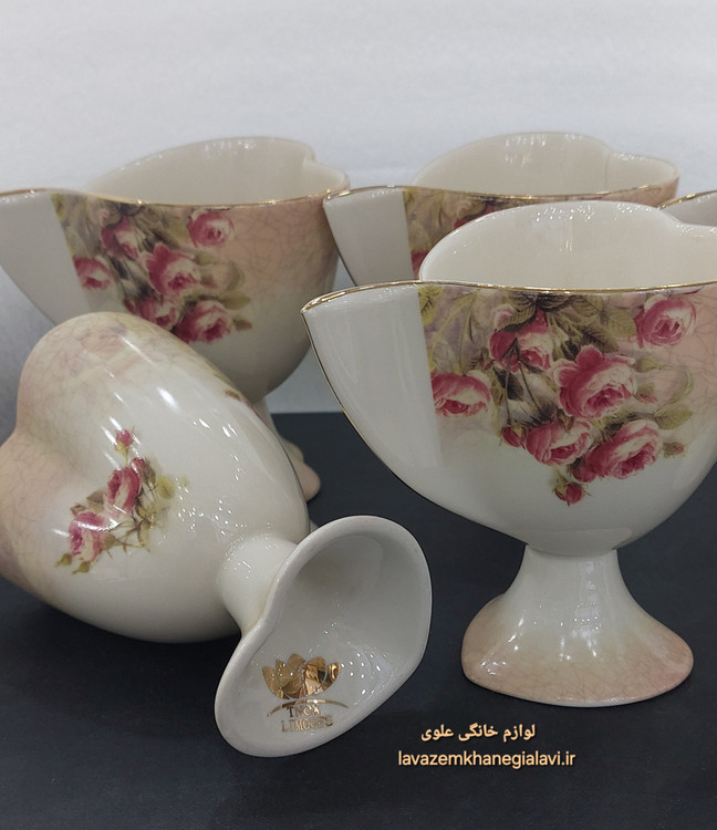 بستنی خوری پایه دار و دسته دار لمونژ مدل گل سرخ تعداد در کارتن ۶ عدد بستنی خوری چینی لمونژ +۶ عدد قاشق چینی ساخت کشور چین