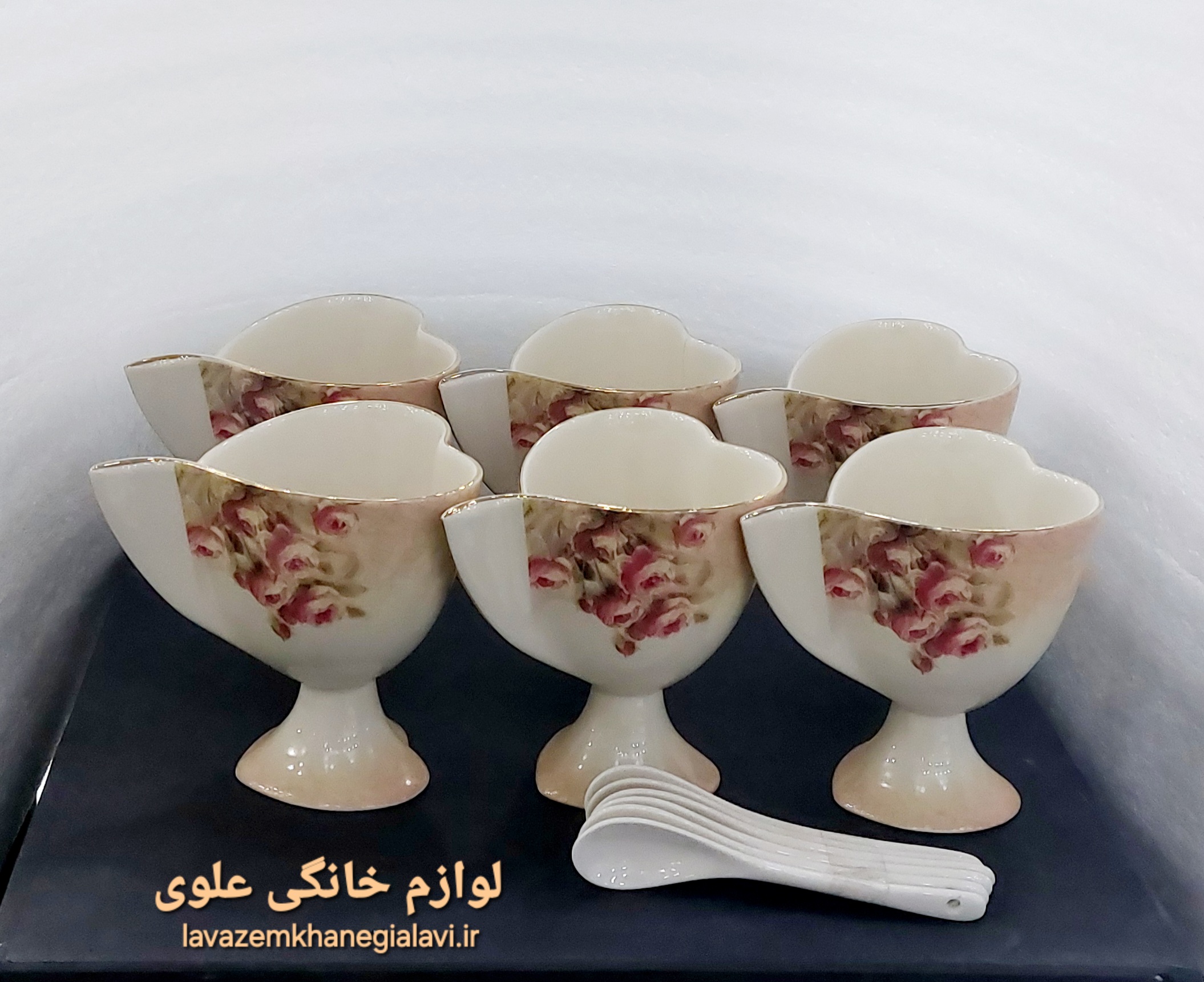 بستنی خوری پایه دار و دسته دار لمونژ مدل گل سرخ تعداد در کارتن ۶ عدد بستنی خوری چینی لمونژ +۶ عدد قاشق چینی ساخت کشور چین