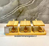 پایه و درب چوبی، 3 عدد قاشق چوبی ، چوب Lonawood و ضد آب، این مدل دارای 3 پیاله اکلرولیک با قطر 4 میل هست، طول ظرف 30 سانتی متر و عرض آن 11 سانتی متره و این محصول فاقد کارتن کاغذی است.