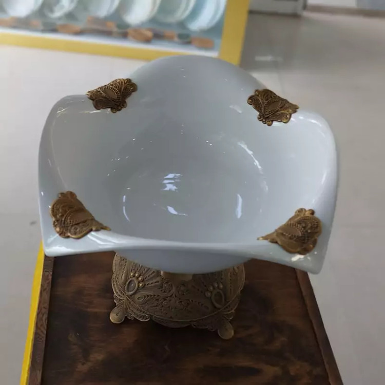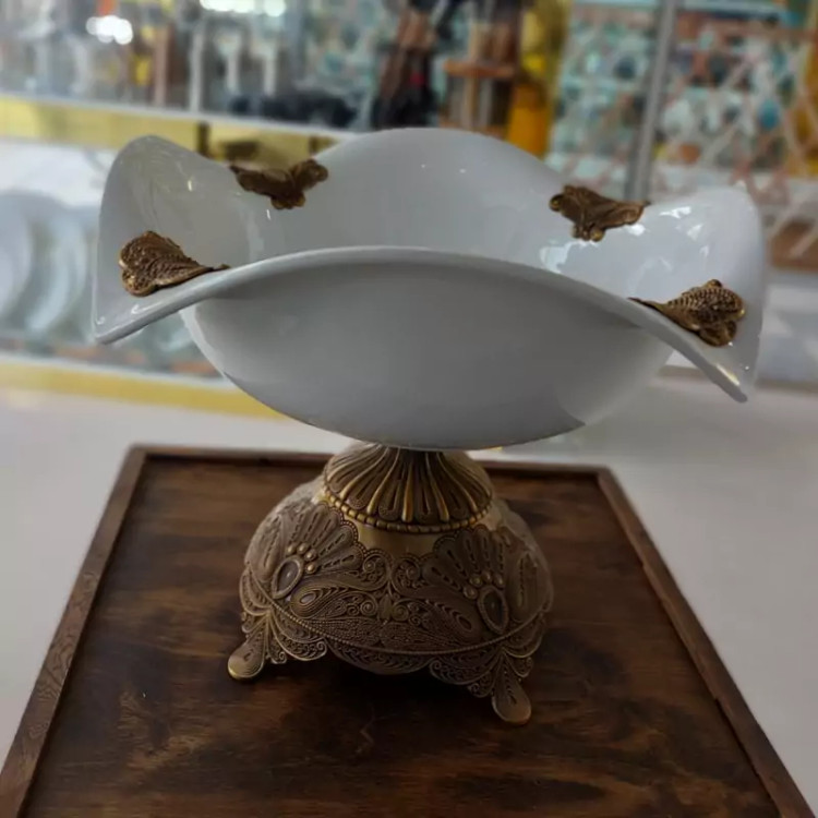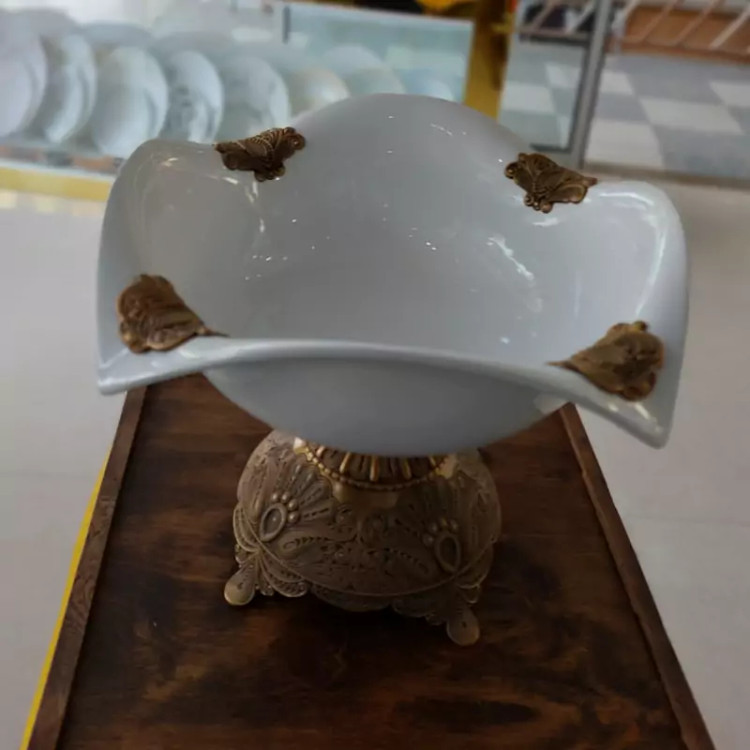 ظرف رومیزی 4 پر پیوتر و چینی برند ریور ساخت کشور چین ، پایه جداشونده و پیچی ، سیاه قلم کاری شده و ساخت کشور چین عرض و طول کالا 32 سانتیمتر و مربع هست